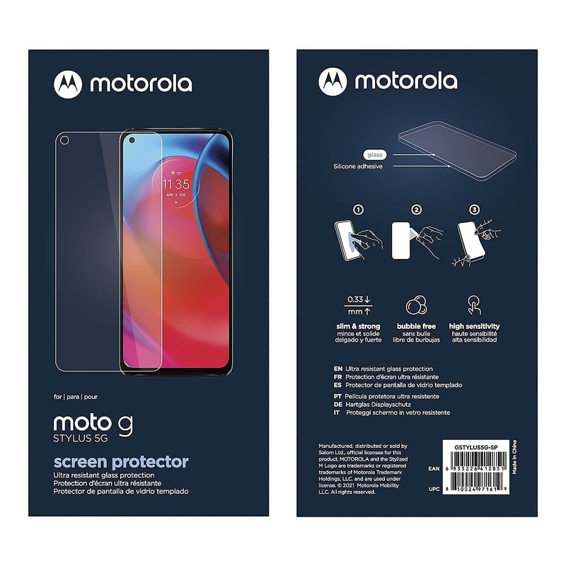 • Motorola Original- Moto G Stylus 5G tempered glass screen protector in retail packaging. (This is NOT for Moto G Stylus 2020 or G Stylus 5G 2022!! Please verify your phone is the G Stylus 5G before ordering)
