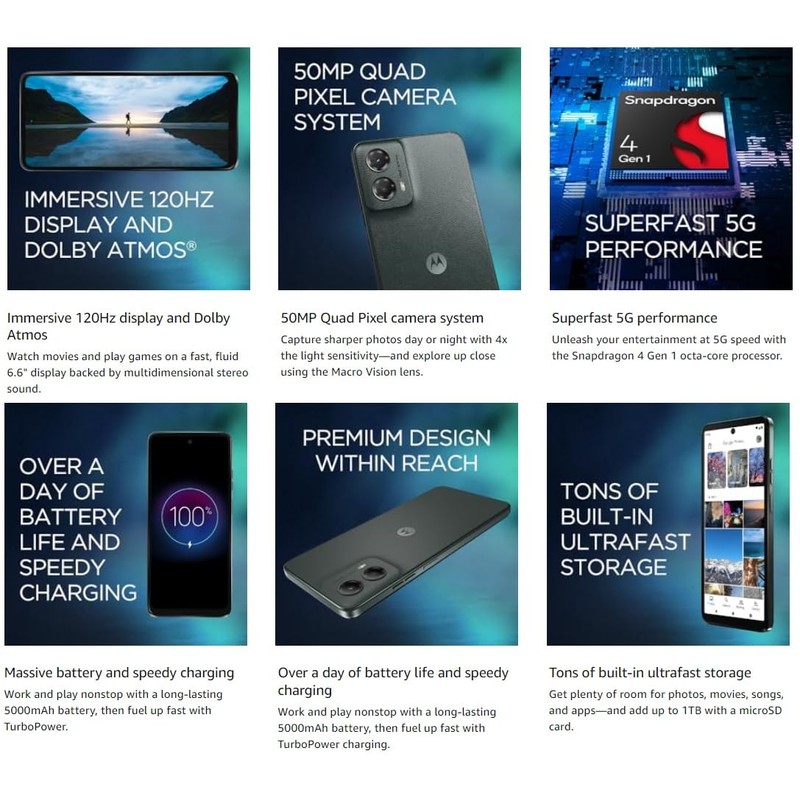 The Moto G 5G (2024) is an affordable smartphone that offers a 6.6-inch LCD display with a 120Hz refresh rate, providing smooth visuals. Powered by a Snapdragon 4 Gen 1 processor, it includes 4GB of RAM and 128GB of storage, expandable via microSD. The device features a 50MP main camera and a 2MP macro lens, along with an 8MP front-facing camera. Its 5,000 mAh battery ensures extended usage, and the vegan leather back adds a touch of style.
