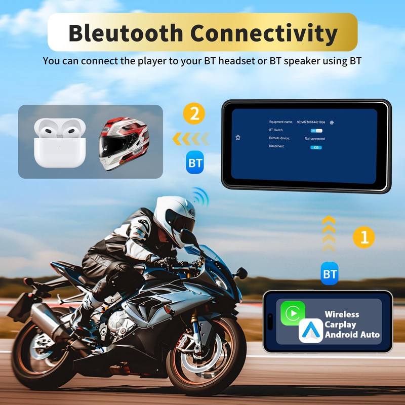 - 【Bluetooth dual incorporado】 La visualización de reproducción de motocicleta de 6.2 pulgadas soporta la sincronización con tu teléfono inteligente y auriculares o casco habilitados para Bluetooth, lo que te permite hacer y recibir llamadas de forma inalámbrica o disfrutar de tu música favorita sin quitarte el casco. Utiliza el casco o los auriculares para ajustar cómodamente el volumen, cambiar canciones y hacer llamadas sin sacar tu teléfono, y disfruta de la libertad de conducción.