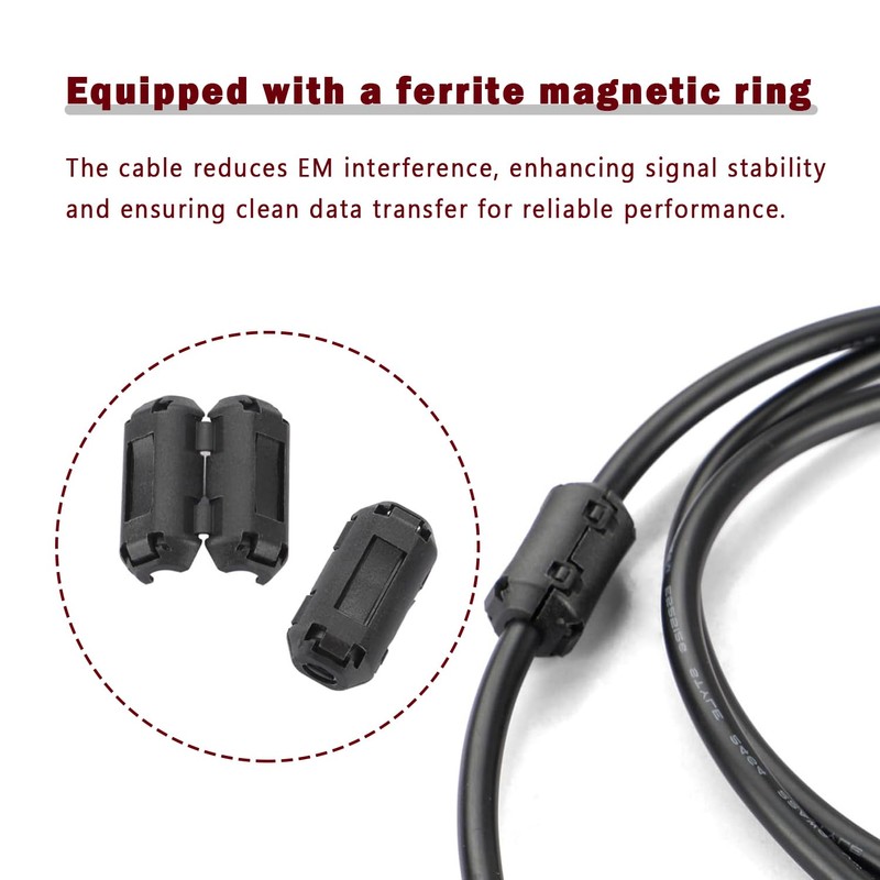 - Equipped with a ferrite magnetic ring, this cable reduces EM interference, enhancing signal stability and ensuring clean data transfer for reliable performance.
