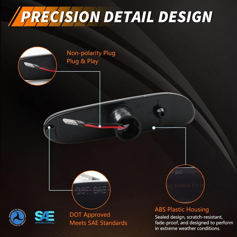 - [Paquete y Wa-rranty] aprobado por DOT y cumple con las normas SAE. El paquete viene con 2 lámparas de marcador lateral. Si tienes alguna pregunta o duda sobre la instalación o la calidad del producto, no dudes en ponerte en contacto con nosotros. Ofrecemos a nuestros clientes un soporte posventa completo con un wa-rranty de un año.