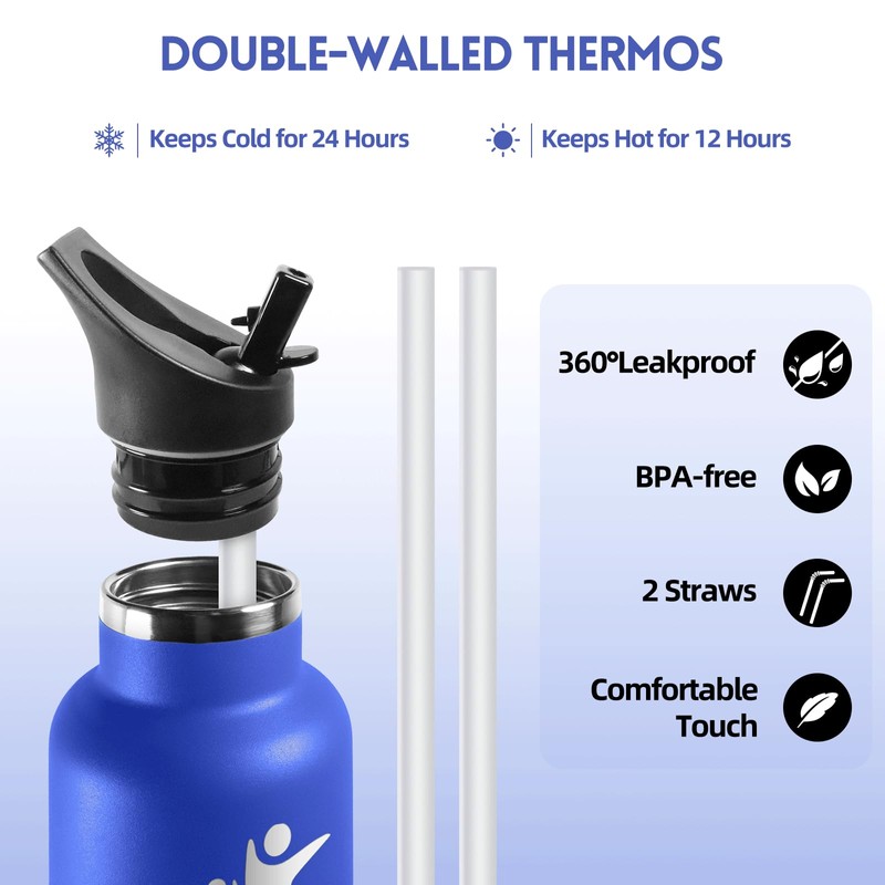 - [DOUBLE CAPS DESIGN]: Two interchangeable cap types - All caps are made of BPA-free plastic with silicone seal and screw cap. Cap with Straw and Handle - The sports cap allows you to drink without taking off the cap, so you can drink comfortably whenever you need to refill water. Cap with classic closure - easy to carry or attach to backpack. Whether camping, school or gym, you can take it anywhere.