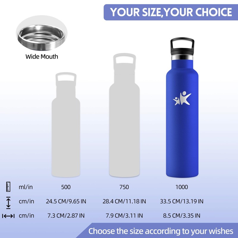 - [100% STAINLESS STEEL]: Our water bottle is BPA free and made of food grade 304 (18/8) stainless steel. The material is shatterproof, very durable and free from metal residue. Enjoy lemonade, fruit tea, milk or coffee. It is an excellent insulated water bottle that helps you stay moist, suitable for children and adults.
