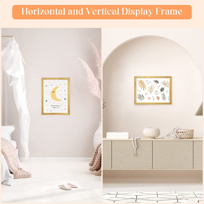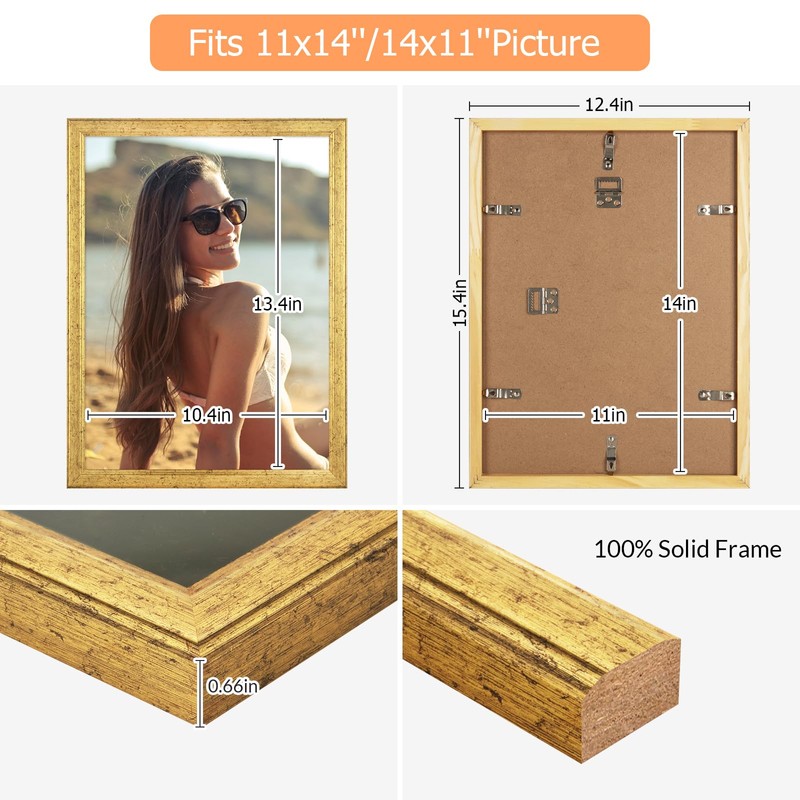 - ✔11x14/14x11 Wall Hanging Frame Size ➡The wood distressed gold pic frame can hold 11x14 picture display vertically, or 14x11 picture display horizontally, 0.6 inches thick frame, perfectly showcase your favorite memorical picture, photos, posters, wall art, landscape, painting art prints, diamond art picture.