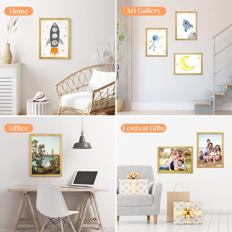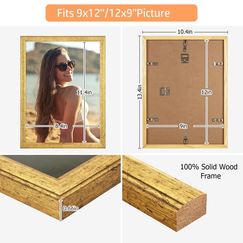 - ✔9x12/12x9 Wall Hanging Frame Size ➡The wood distressed gold pic frame can hold 9x12 picture display vertically, or 12x9 picture display horizontally, 0.6 inches thick frame, perfectly showcase your favorite memorical picture, photos, posters, wall art, landscape, painting art prints, diamond art picture.