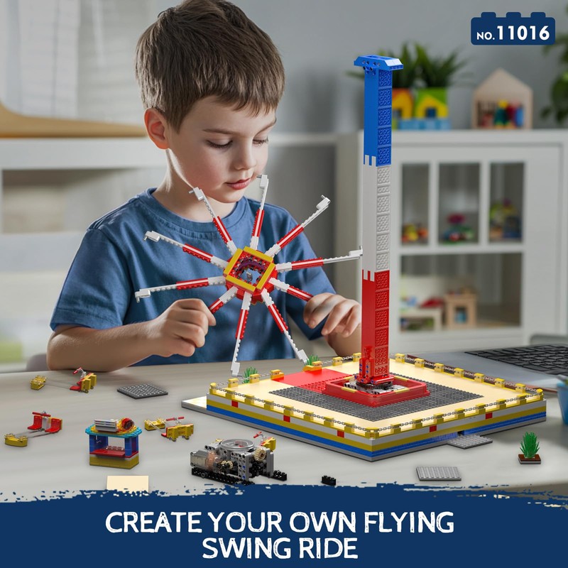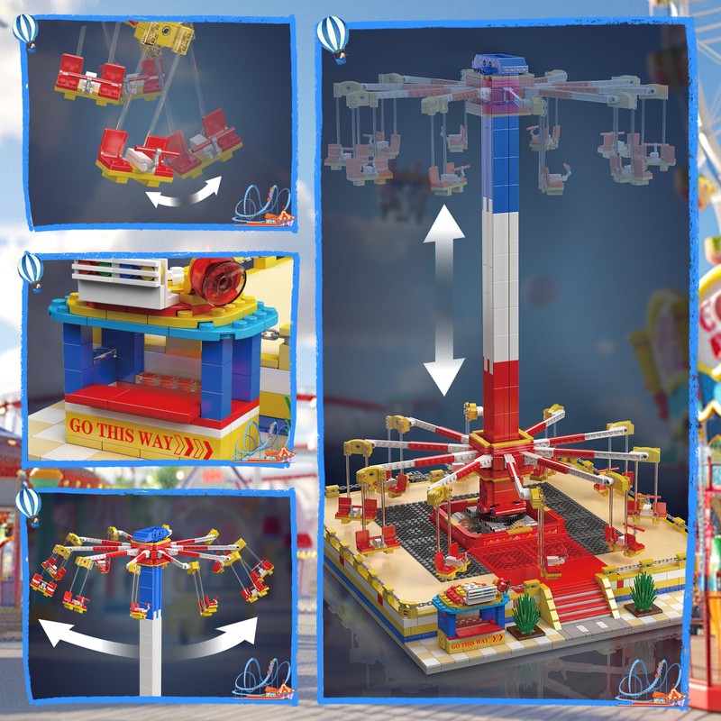 - [Flying Swing Ride Model]: Inspired by classic amusement facilities, the Mould King 11016 building set restores the dynamic beauty of the centrifugal rotation of the flying chair. The colorful seats and smooth bracket design create a visually stunning building block artwork that shows the agile effect of flying in the air.