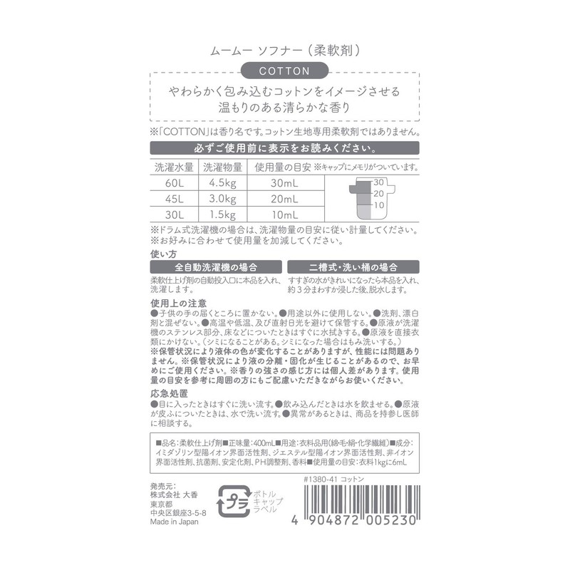 moumou Softener Cotton Softener (Warm and Clean Scent), 13.5 fl oz (400 ml)