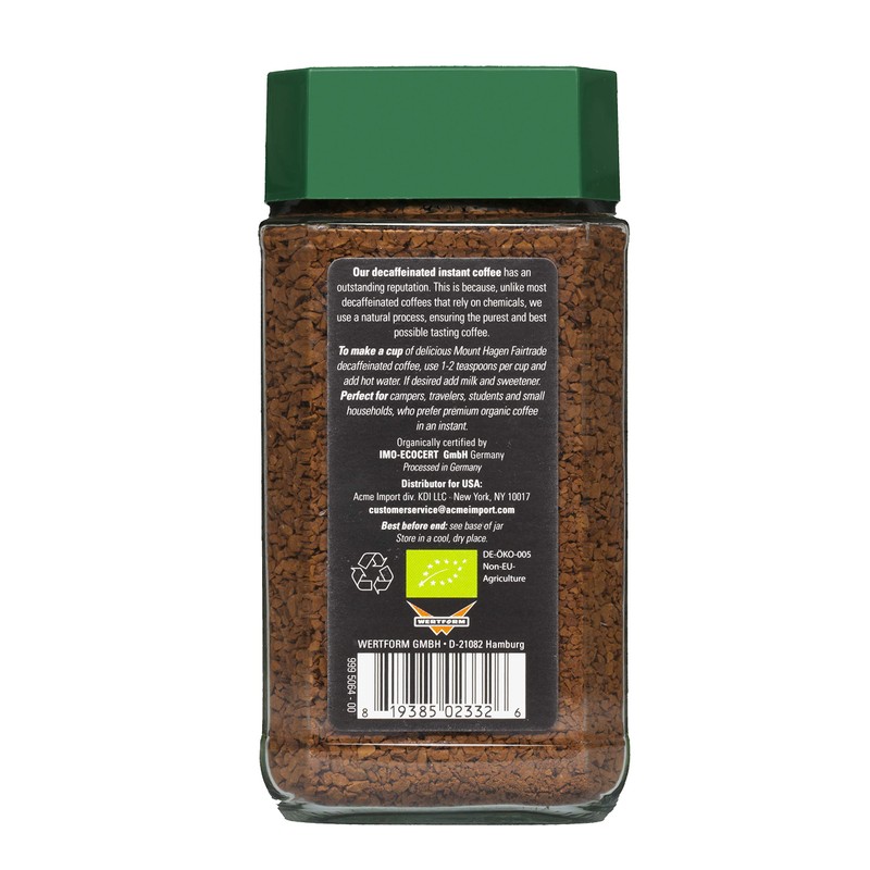 - AWARD-WINNING: Mount Hagen consistently tops lists of best instant organic coffees, becoming many a connoisseur's favorite joe-on-the-go. (Google it, and you’ll see!) Our superior instant decaf coffee is made from 100% USDA Organic, Fairtrade Arabica beans, with 99.99% of the caffeine extracted using our patented CO2 decaffeination process- meaning you get all the flavor without the caffeine. Mount Hagen coffee is also gluten-free and certified OU Kosher.