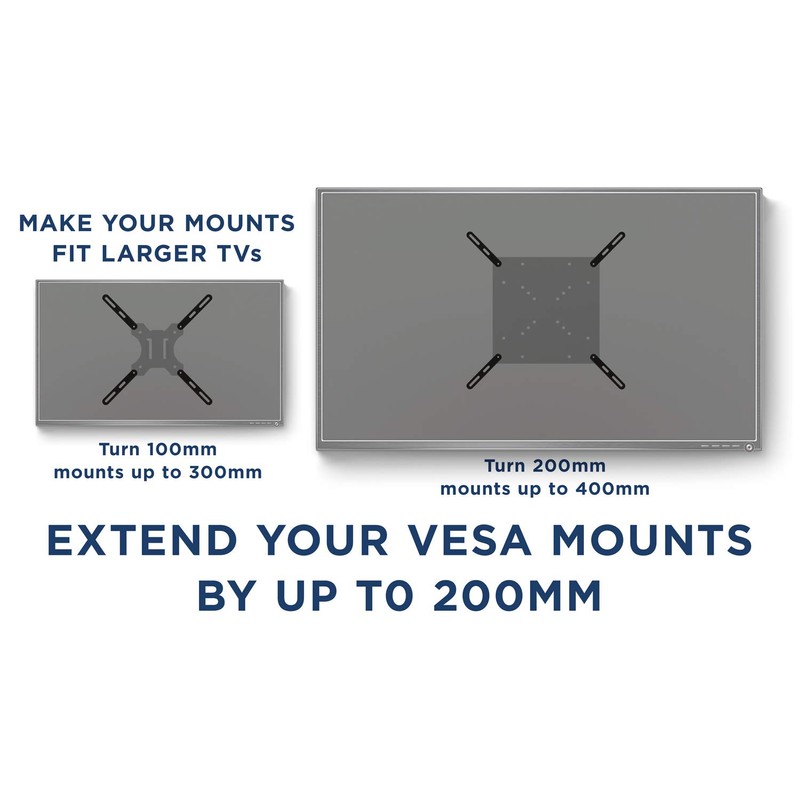 - VESA EXTENSION KIT: Bought a bigger TV or monitor but don’t want to buy another TV mount? This VESA adapter kit is designed to convert 200x200mm VESA patterns to 400x200 and 400x400 mm. It also converts 100x100mm to 200x200mm and 300x300mm.