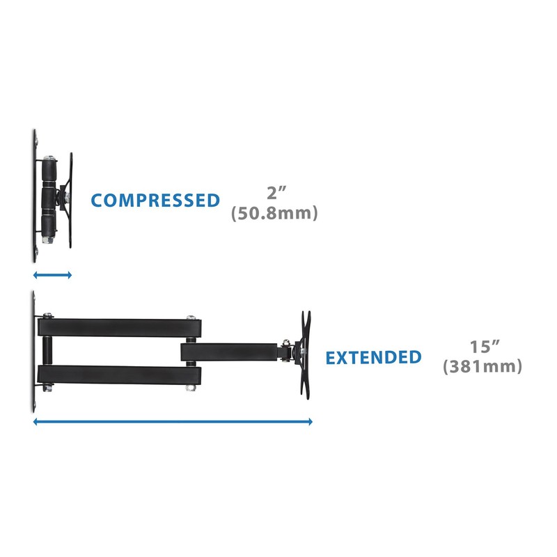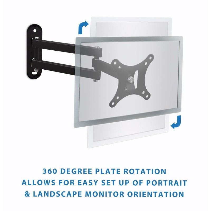 - FEATURES: VESA wall mount arm can fold to bring the screen right up against the wall, or can extend out another 14 inches. The VESA plate head will tilt up or down 15 degrees or rotate 180 degrees to put screen in landscape or portrait orientation, and arm can swivel 180 degrees to left and right. Its sturdy construction holds up to a whopping 40 pounds!
