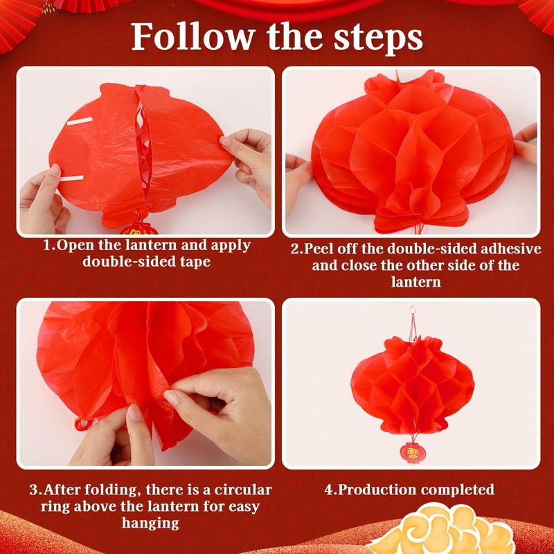 - Easy to Used: The Chinese New Year hanging decorations and Chinese paper lanterns are not only gorgeous in appearance, but also very simple to install. Chinese New Year hanging decorations can be hung easily, and Chinese lanterns are equipped with convenient lanyards and tapes, so you can easily create fantastic holiday scenes, so that you can concentrate more on enjoying the festival