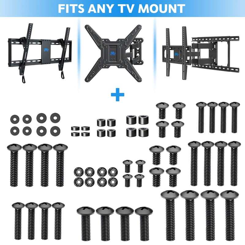 - Universal kit - Includes M4, M5, M6, and M8 TV screws, washers & spacers, fits All TVs and Monitors, works with any TV mount, Monitor Mount and TV Stand.