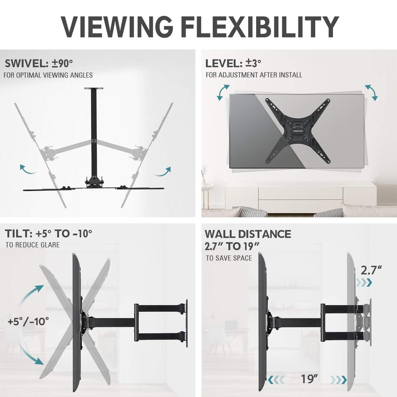 - UPGRADED VIEWING EXPERIENCE - Full motion TV wall bracket make your viewing more flexible. This TV wall mount allows tilt +5° /-10°, swivel +/- 90° and rotates +/- 3°, providing a comfortable viewing experience no matter what different areas of the room you sit.