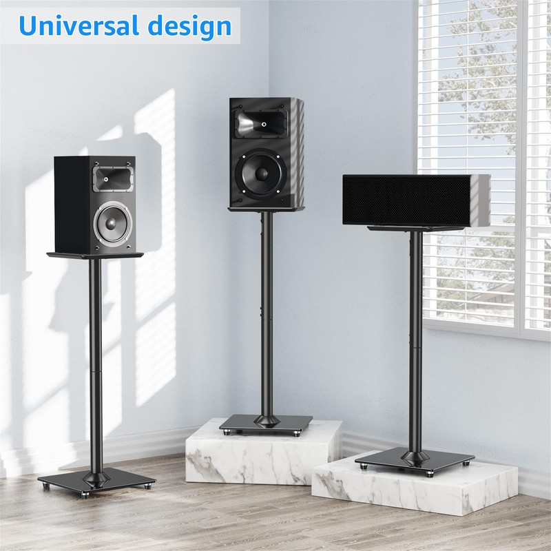 - STURDY AND STABLE: This speaker stands pair is made of durable heavy-duty alloy steel with a sturdy 11.8" tempered glass base. It has passed our strength and safety test to ensure the security of your speaker before launch. We provide rubber foot pads for tile/wood floors and metal nails for carpets to adapt to all scenes with stability