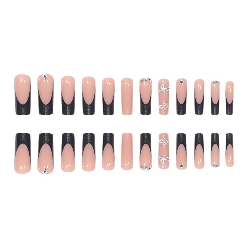 MouyouGlow Press on Nails Lang,Square Nude Schwarz Glitzer French 3D Schmetterling Strass Y2K Coquette Fake Nails Kunstnägel mit Nagelkleber,Black Tips Butterfly Sommer Künstliche Fingernägel