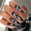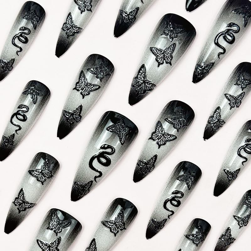 MouyouGlow Press on Nails Long, Stiletto Airbrushing Black 3D Butterfly Snake Gothic Fake Nails with Nail Glue, Black Gradient Butterfly Snake Artificial Fingernails