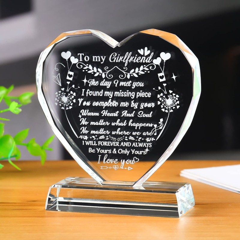 - đź’•Super Craftsđź’• A beautiful heart keepsake for girlfriend. The love words are etched in the middle of glass by advanced laser engraving technology, it will never be rub off and faded, can be preserved for a long time just like your love for your beautiful girlfriend or fiancee. This is a remind for your girlfriend how much you love her