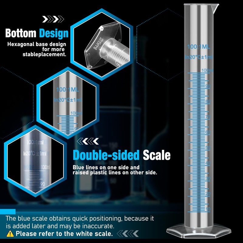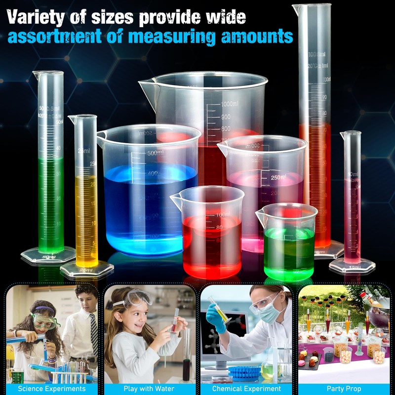 - Product Package: 4 sizes transparent plastic measuring cylinders (10, 25, 50, 100 ml); 5 sizes transparent plastic beakers (50, 100, 250, 500, 1000 ml); 5 Pipettes (3 ml); 1 test tube brush (METRIC SYSTEM)