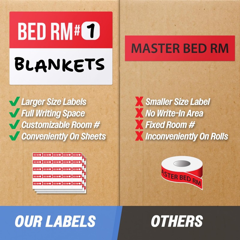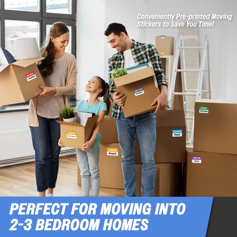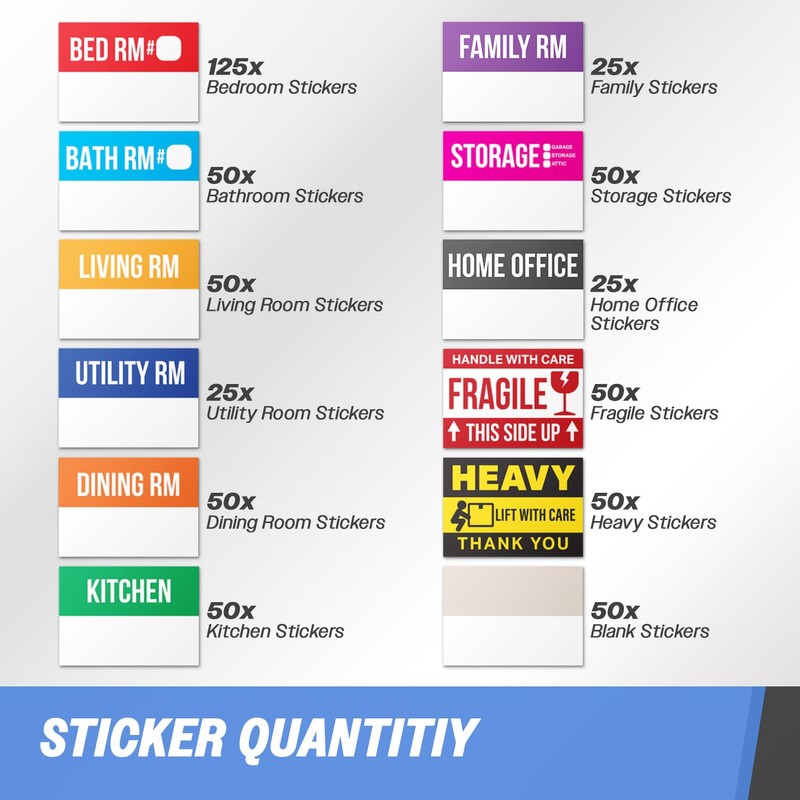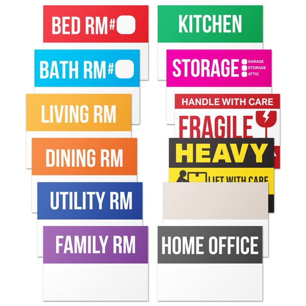 - BIG QUANTITY: 600 Labels are Ideal for 2-3 Bedroom Homes and Include: 125 Bedroom, 50 Bathroom, 50 Living Room, 50 Dining Room, 25 Utility Room, 50 Kitchen, 25 Family Room, 25 Home Office, 50 Storage Room, 50 Fragile, 50 Heavy & 50 Blank Stickers