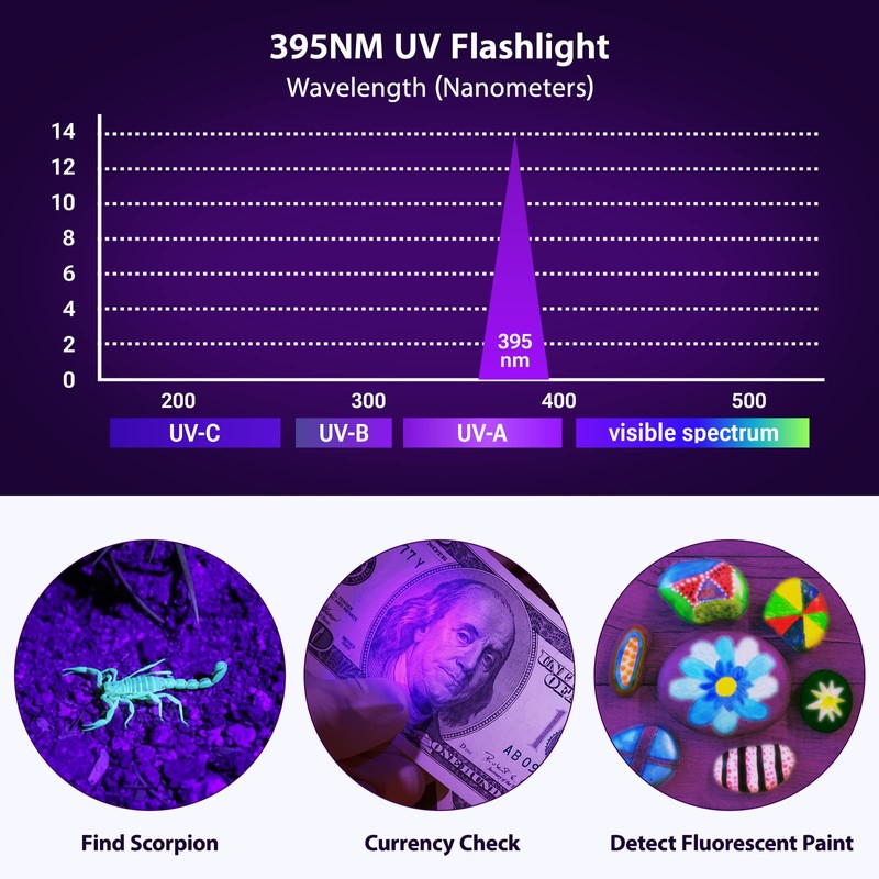 • 🔦Stain & Pet Urine Detection🔦: 395NM UV flashlight helps detect food stains and pet urine stains on carpets, clothes and toilets that are invisible to the naked eye. It has a significant effect on dog urine.It can also be used for forged document detection, currency verification, amber ,jewelry detection, scorpion,and body art.