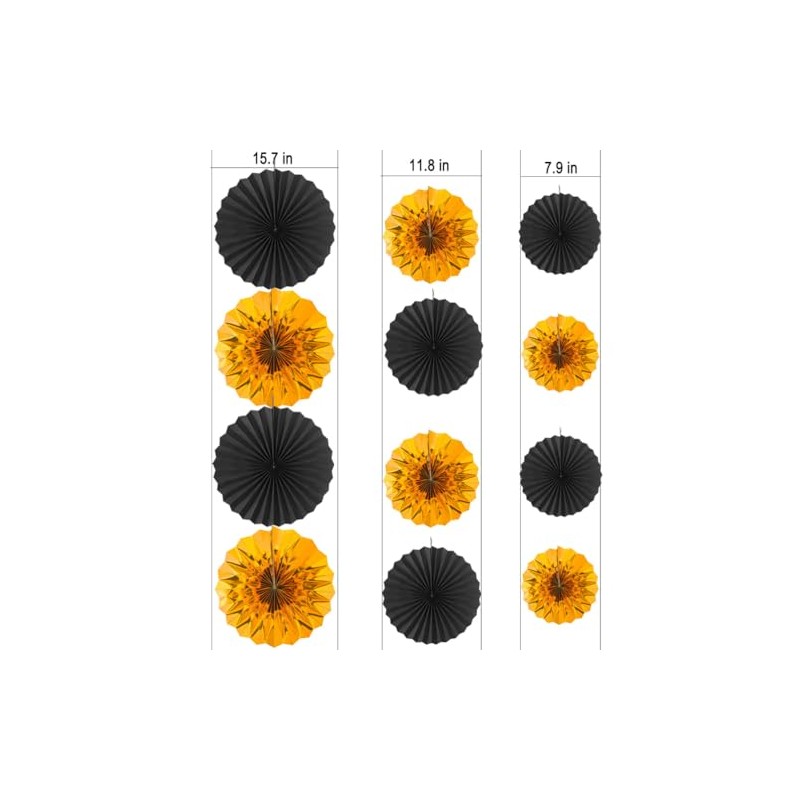 - Gold and Black Party Decorations Paper Fans 12pc craft paper fans on both sides of paper, 3 different sizes measuring 15.7'' /11.8'' / 7.9'' in diameter