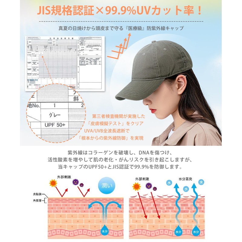 - (Certified to block out more than 99.9% of UV rays; 3D draping wide brim) The materials used for this women's cap have passed the test of compliance with the JIS standards by a third party inspection agency and has achieved UPF50+. This hat blocks UVA/UVB rays in full wavelength bands to prevent skin and scalp damage from sunburn. The 3D cut wide brim women's cap covers the entire face and is designed to zero exposure to the nose, eyes, and cheekbones. This hat is especially effective in direct sunlight and reflected UV rays when mountain climbing, and on the sand, making it perfect for no sundresses