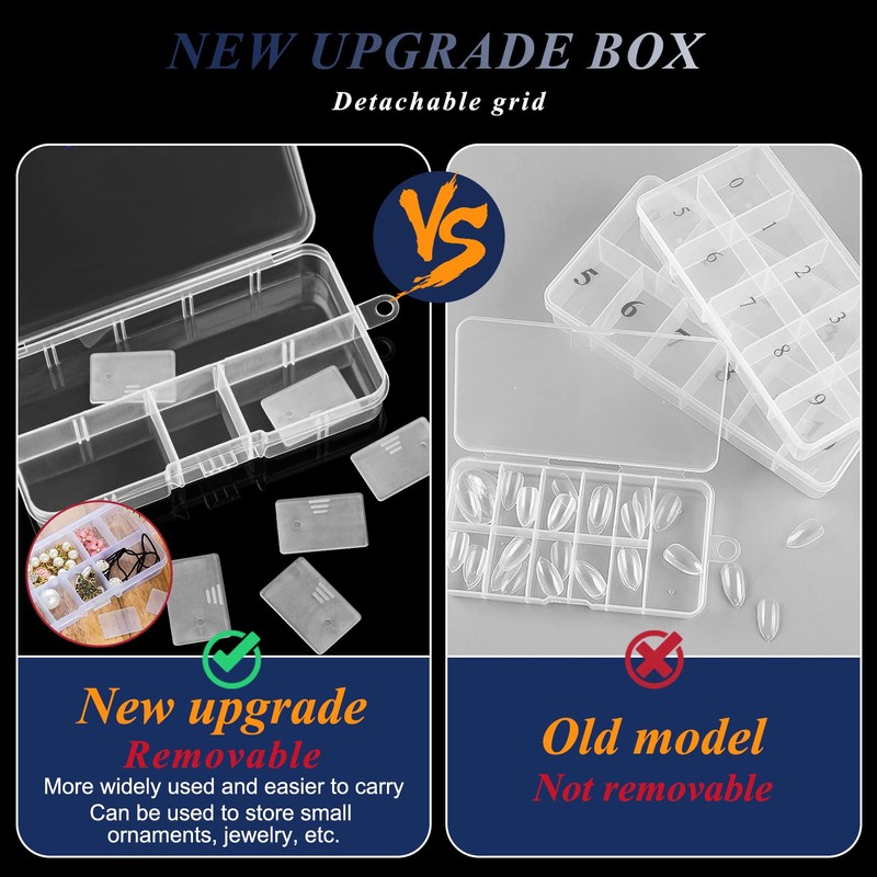 - đ ăRemovable Boxă: The box compartment we made removable, the space of each small compartment can be adjusted, expanding the reusability of the box and reducing the waste of resources; the fake nails can be used to store matching items and accessories when you are done with them, compact in size, easy to carry and find.