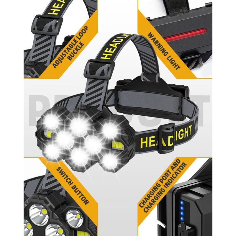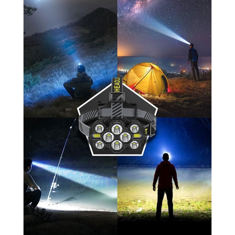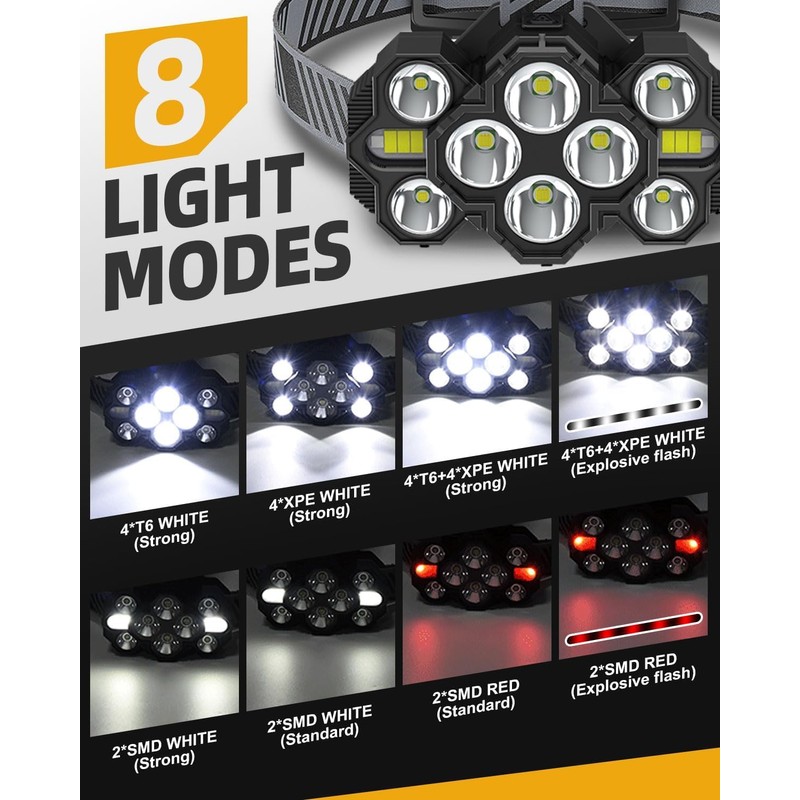 - SUPER BRIGHT 10 LED & LONG-LASTING HEAD TORCH RECHARGEABLE: With advanced T64 + XPE4 + SMD*8 LED bulbs, this head torch led super bright rechargeable offers three times longer and brighter illumination on a single charge compared to regular head torches on the market. The upgraded high-quality battery supports 3-hour fast charging, providing 7-8 hours of use time.