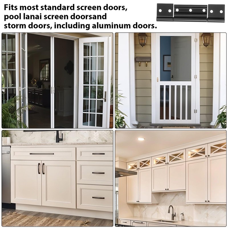- Ideal Compatibility: our black screen door hinges are compatible with most patio screen doors, security is Ideal for most standard screen doors and storm doors, such as pool screen doors, pool patio doors, storm doors, wooden screen doors, etc., extruded aluminum door hinges, grooved center leaves ensure seamless fit, a versatile choice for any homeowner