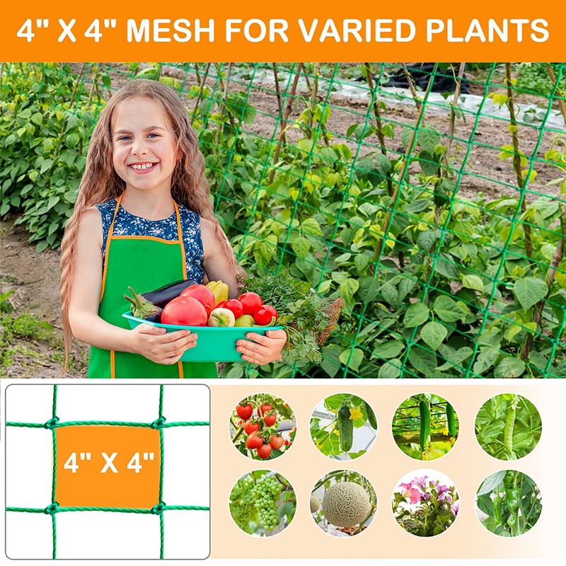 Product Description:Color: GreenSize:5.9x3 FT5.9x5.9 FT5.9x8.9 FT5.9x11.8 FT5.9x16.5 FTPlease choose the size that suits you. Upgraded Version:Ideal aperture for plant growth - 4*4 inch meshSturdy and stable mesh structureHeavy duty plant net with enhanced load-bearing capacity27 strands thick nylon (not 18 strands) This mesh for outdoor climbing plants is suitable for growing peas, beans, cucumbers, tomatoes, flowers or any climbing plants or vegetables. It is made of nylon, which is soft and durable, strong enough to support heavy crops and plants, and easy to use. Easy to install - It is easy to cut to the right size with ordinary scissors. Hang on the tree, in the garden or on the wall. Suitable for vertical and horizontal gardening.