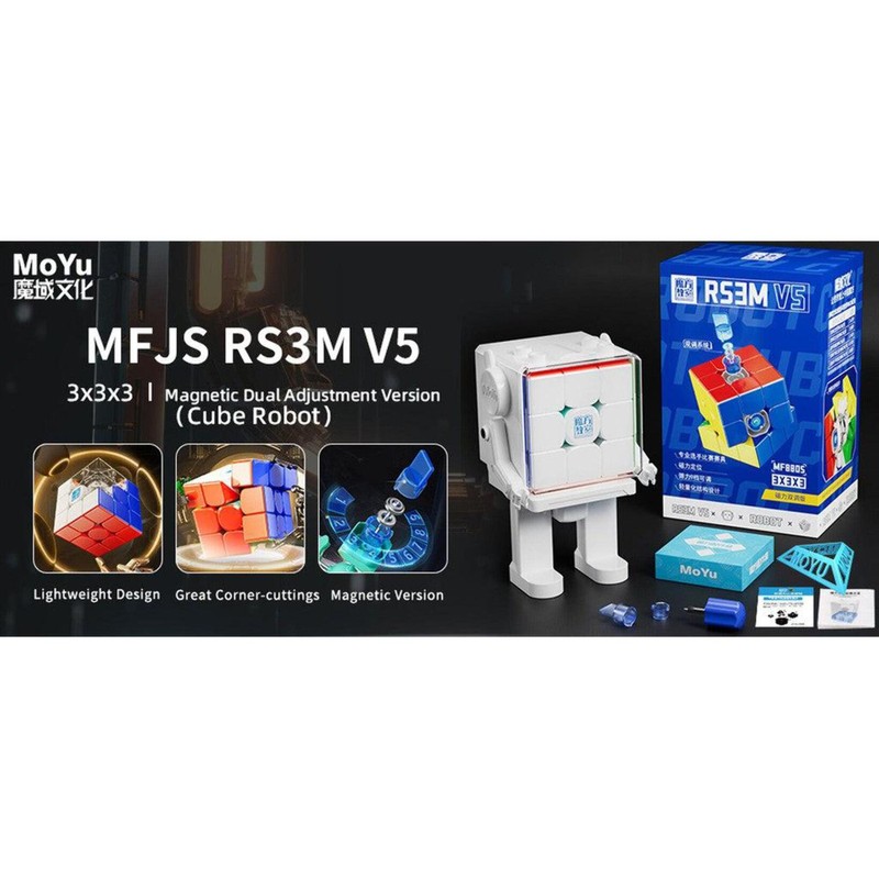 MoYu RS3 M 3x3 V5 (Magnetic) - Dual-Adjustment + Robot Box is the successor to the legendary RS3 M 2020 that took the cubing community by storm! Version comparison Standard Dual-Adjustment MagLev Ball-Core Auto-alignment - - - 2.0 Magnetic core - - - Yes MagLev - - Yes Yes Dual-adjustment - Spring MagLev MagLev Core settings - 9 9 9 Total magnets 48 48 48 56 Exterior finish Frosted Frosted Frosted UV Coated Internal plastic color Primary Primary Purple Teal Size 55.5mm 55.5mm 55.5mm 55.5mm Weight 65 67 71 75 Dual-adjustment features Classic screw/spring design. Dual-adjustment system (9 settings) Key features Circular core design for increased stability Micro strong magnets Anti-pop mechanism "Dragon scale" piece design for smoother turning Lightweight design Overview 55-degree corner-cutting 35-degree reverse corner-cutting Accessories included Robot display box ($5.95 value) Adjustment tool Screwdriver Display standItem Specifics