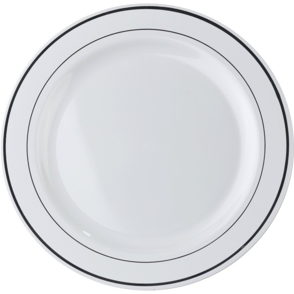 • 19cm (7.5") plastic white small party side plates with a silver rim for 20 people