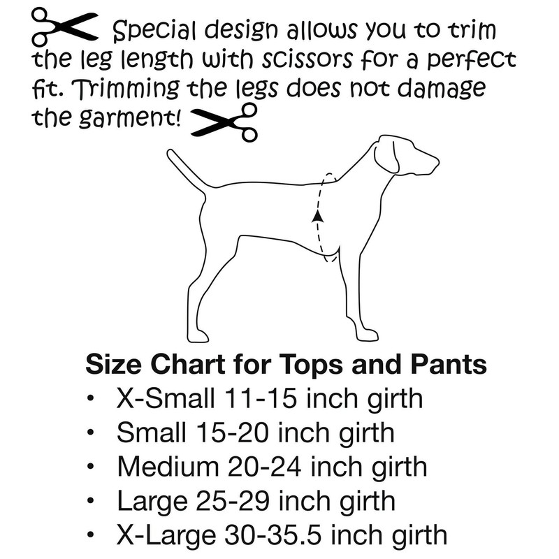 • Adjustable Leg Length - Special design allows you to trim the leg length with scissors, without garment fraying. We suggest you trim the garment legs at least a few inches above the paw. They can be trimmed all the way to short sleeves!