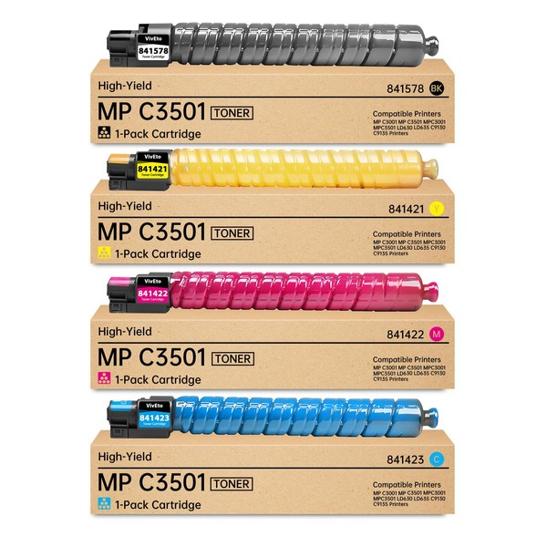 - Contents: VivEto toner replacement for Ricoh MPC3501 MPC3001 toner cartridge; 1 X MP C3501 black toner cartridge (841578); 1 X MP C3501 yellow toner cartridge (841421); 1 X MP C3001 magenta toner cartridge (841422); 1 X MP C3001 cyan toner cartridge (841423)