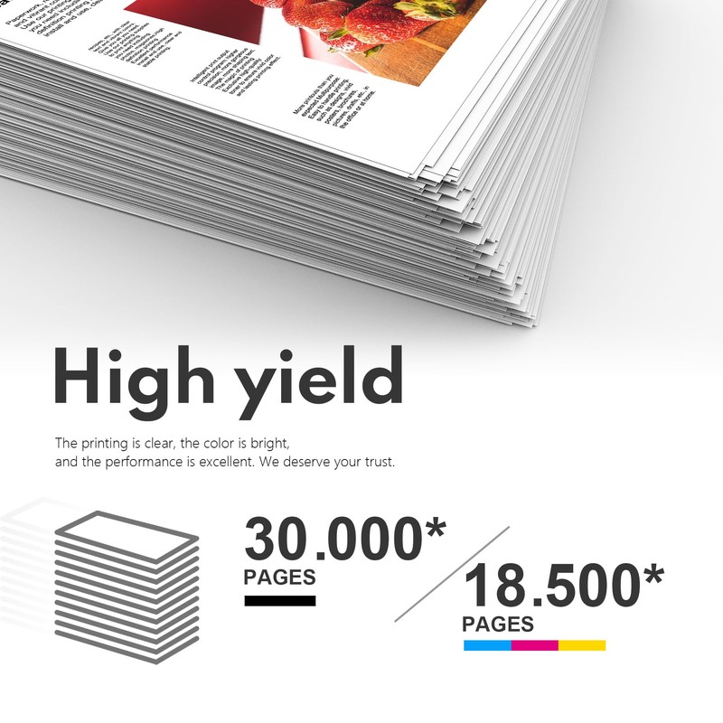 • Page Yield: 30,000 pages per black cartridge and 18,500 pages per color cartridge at 5% coverage (Letter/A4)