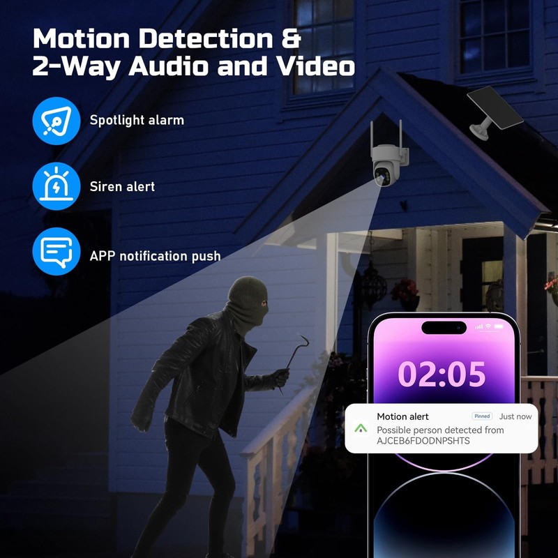 • 【Solar Powered】This outdoor wireless solar camera is equipped with a high-conversion rate solar panel and a rechargeable battery to provide uninterrupted power supply for the outdoor wireless security camera, ensuring 365 days of stable operation, eliminating the trouble of frequent charging and wiring installation.