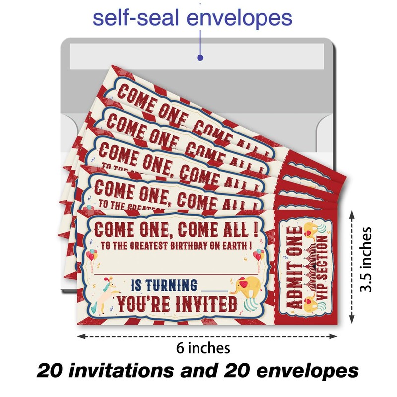 MQCLYSG Carnival Invitations 20 Pack All Circus Carnival Ticket Invitations with Envelopes Invites Cards for Kids Birthday Party