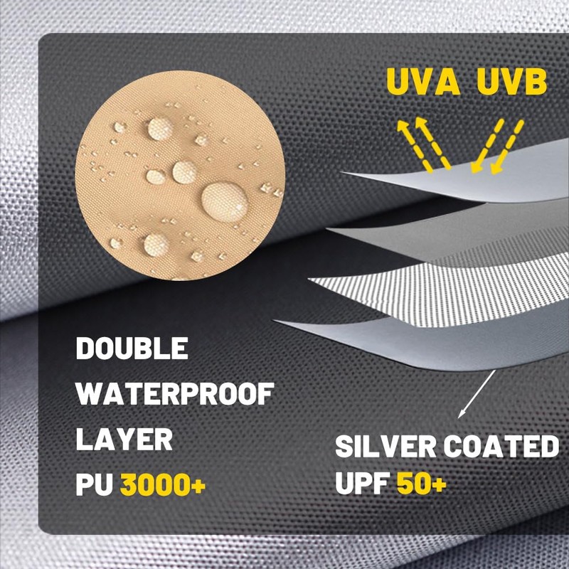 - Upgraded Fabric - Double layer waterproof fabric covering Oxford cloth, PU 3000 mm waterproof effect. Apply silver sunscreen coating on the inside, UPF 50+ insulate from harmful uv rays and quickly cool down. Four layers of thickened fabric to effectively resist strong winds, escaping bad weather is so easy!