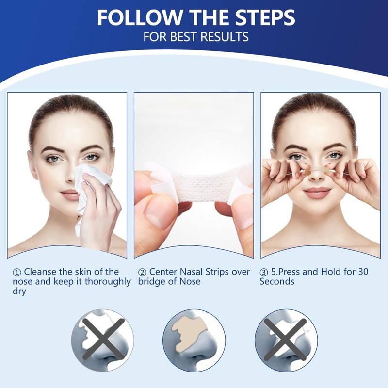 - Easy: 1. Wash nose with soap & and water, dry completely, 2. Center nasal strip over the bridge of the nose, 3. Press and hold for 30 seconds.