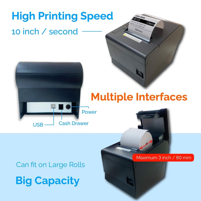 -Fast Printing speed: 10”(250mm) / every second -Auto cutter with long lifespan, Low noise direct thermal printing. -Print Width: 3" (72mm); Paper Width:3 1/8" (80mm); Direct thermal print, no need ink or ribbon -Voltage
