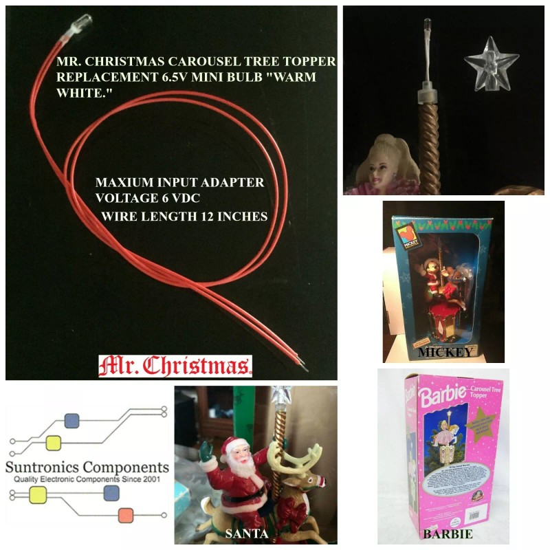 Mr.Christmas "SANTA", "BARBIE", "MICKEY" Carousel Tree Topper replacement 6.5 volt 12 inch wire, "Warm White" filament bulb.