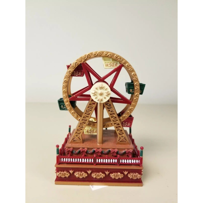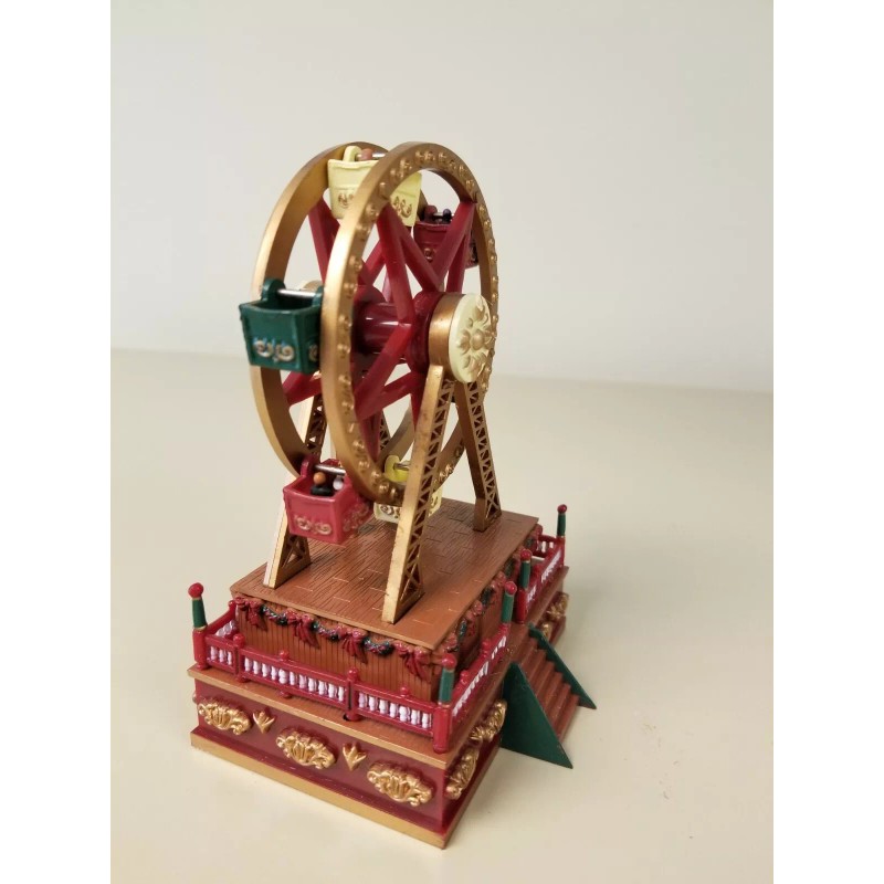 Miniature animated carnival rides. Hand painted details. Plays one wind-up song. Ferris Wheel plays "We Wish You a Merry Christmas."
