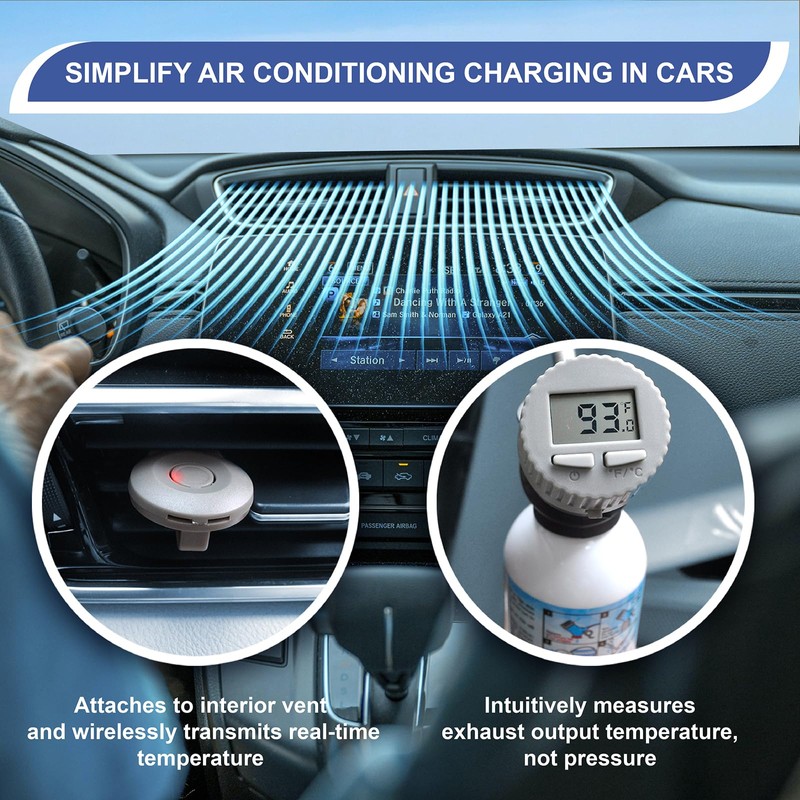 The wireless digital thermometer and display helps you visualize the air temperature at the air vents during the inflation process, so you no longer have to worry about over-pressurizing the air conditioning system, which can vary from vehicle to vehicle.