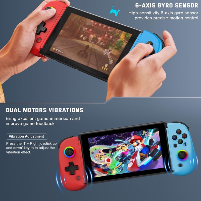 MR. GADGETS Gamepad inalámbrico Bluetooth Joystick Mando Game Controller con Función Turbo Efecto Hall RGB Estirable hasta 25.2cm, Recargable USB-C Compatible con Android, PC, iPadOS (Rojo y azul)