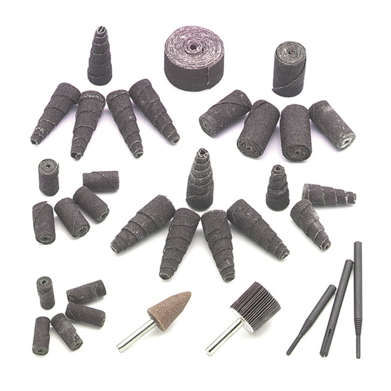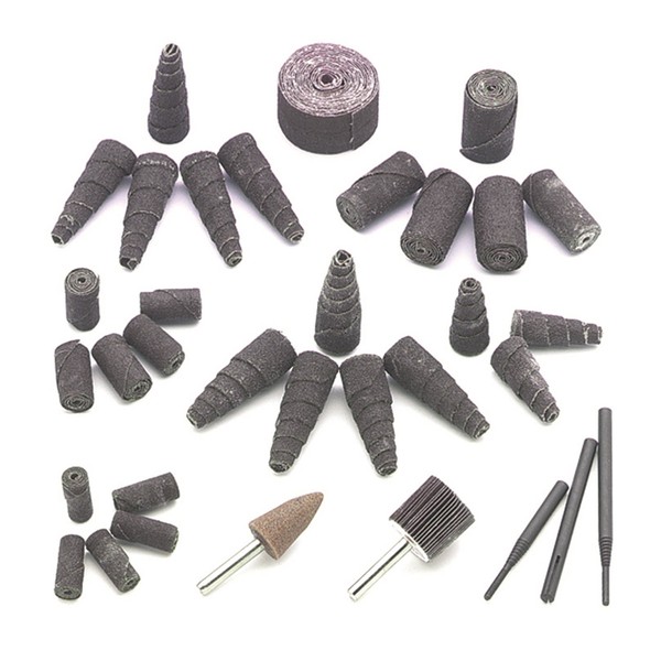 - Contains tapered cutting stone, grind-polishing rolls mini grind-flex flat wheel and various length mandrels