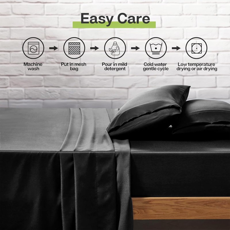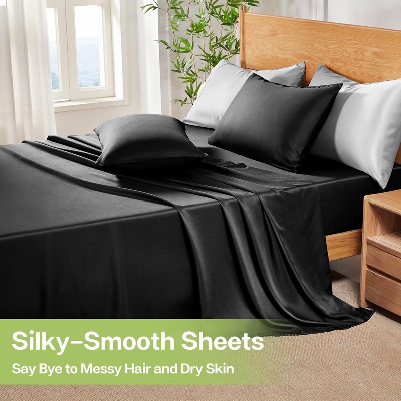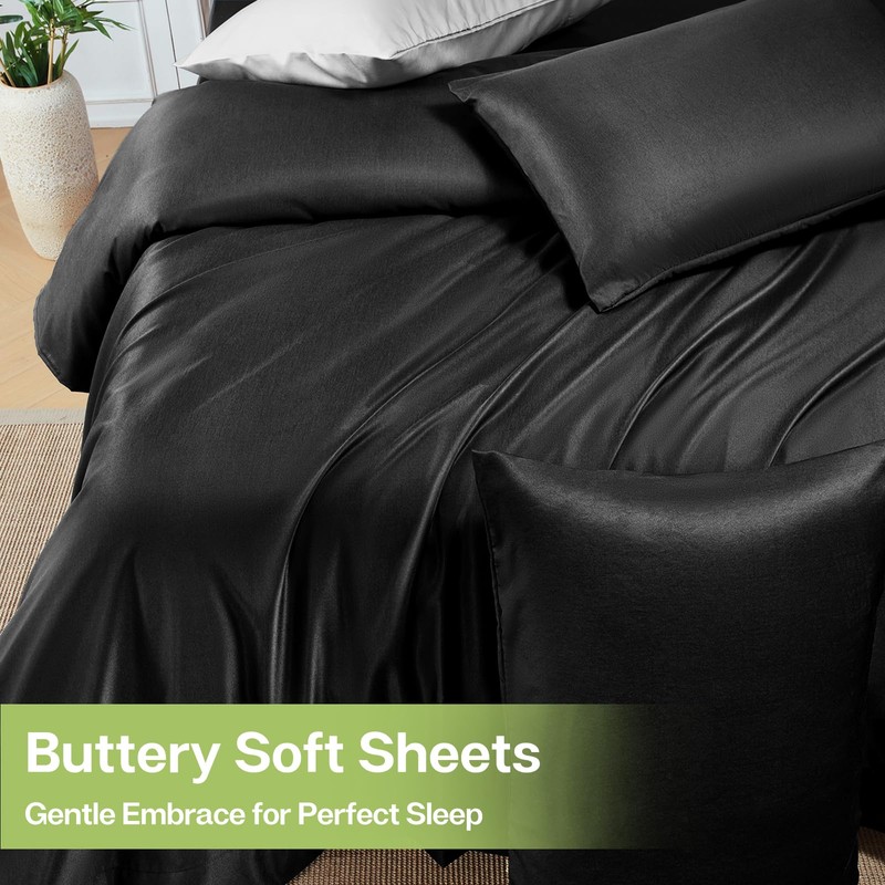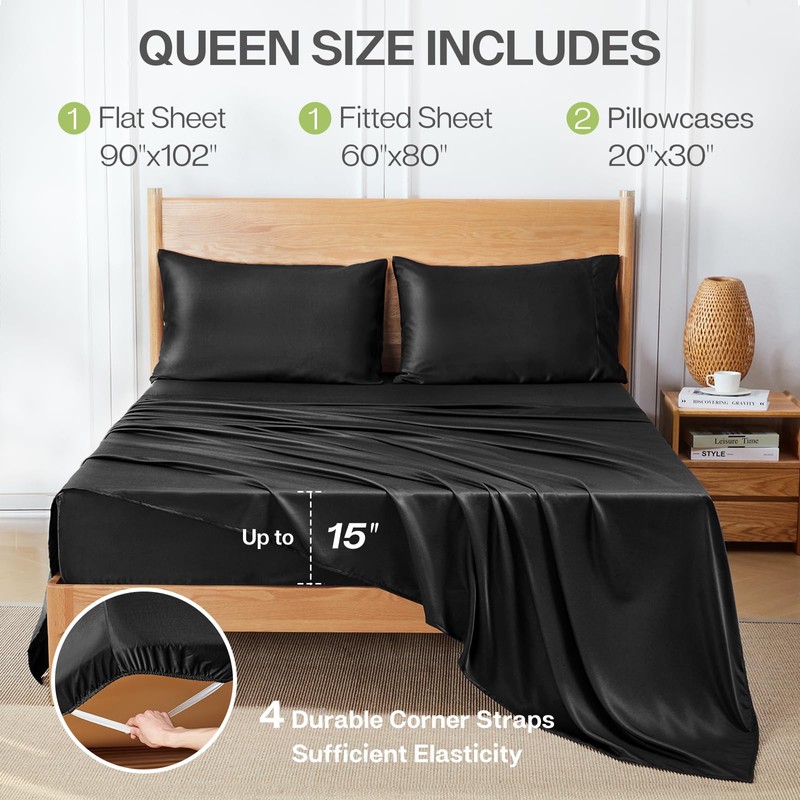 MR&HM Queen Sheet Set, 4-Piece Cooling Sheets, Rayon Derived from Bamboo & Polyester Blend, Soft & Silky, 15" Deep Pockets with Elastic Straps, Hotel Luxury for Hot Sleepers, Black
