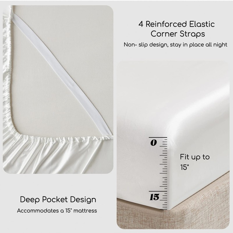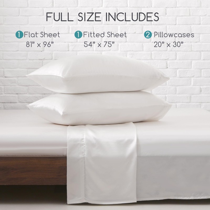 - Full Size Bed Sheets Set 4 Pcs: Our package includes 1 Flat Sheet: 81"x 96", 1 Fitted Sheet: 54"x 75" + 15" Deep Pocket, 2 Pillowcases: 20"x 30". Reinforced elastic corner straps securely wrap around your mattress, effortlessly solving the slipping issues of satin and letting you enjoy a smooth, comfortable night.