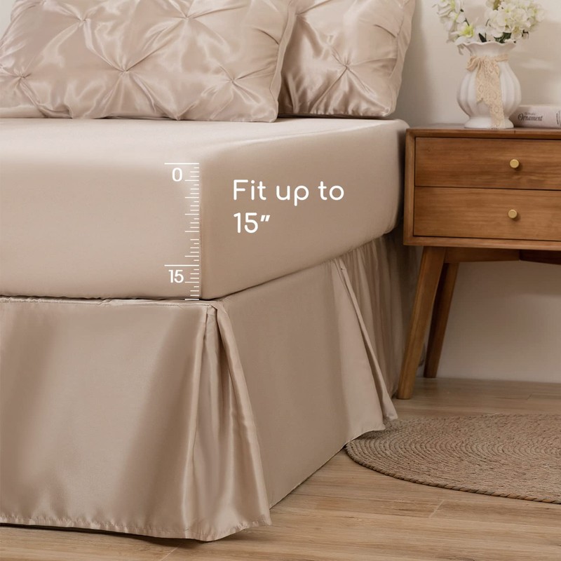 MR&HM Satin Comforter King 8 Pieces - Luxurious Pinch Pleat Bedding Set with Comforter, Sheets, Bed Skirt, Pillowcases & Shams, Super Silky Soft Bed Set for All Season (King, Champagne)
