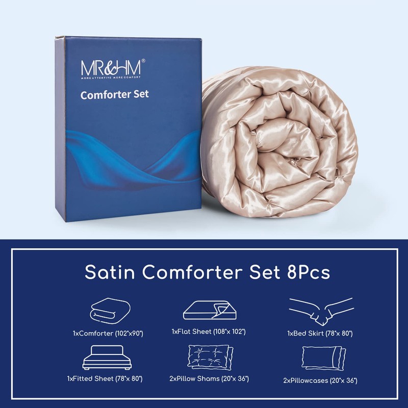 MR&HM Satin Comforter King 8 Pieces - Luxurious Pinch Pleat Bedding Set with Comforter, Sheets, Bed Skirt, Pillowcases & Shams, Super Silky Soft Bed Set for All Season (King, Champagne)