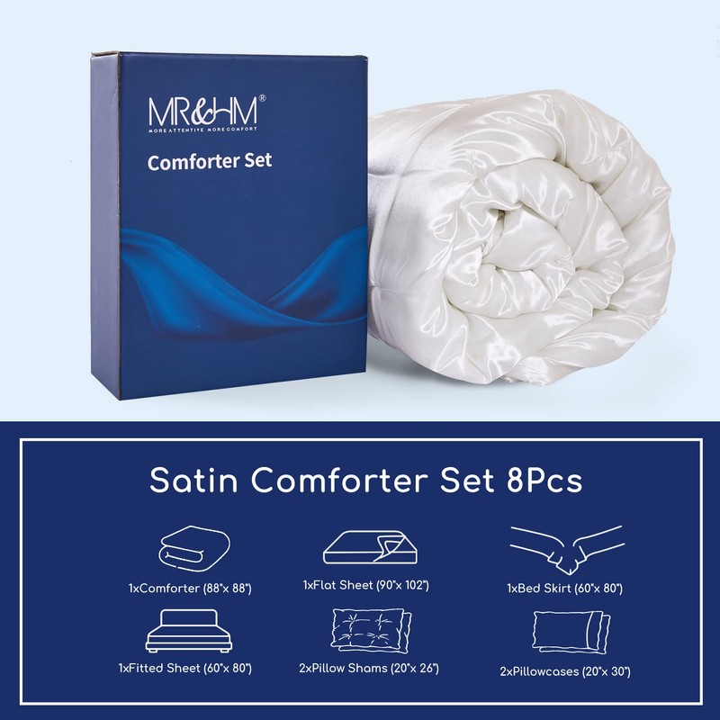 MR&HM Satin Comforter Queen 8 Pieces - Luxurious Pinch Pleat Bedding Set with Comforter, Sheets, Bed Skirt, Pillowcases & Shams, Super Silky Soft Bed Set for All Season (Queen, Ivory)
